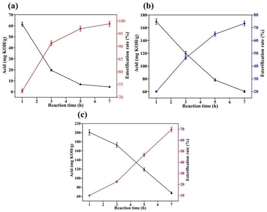 Results of catalytic esterification with different catalysts at 180 °C: (a): concentrated sulfuric acid; (b): sodium hydroxide; and (c): sulfamic acid.
