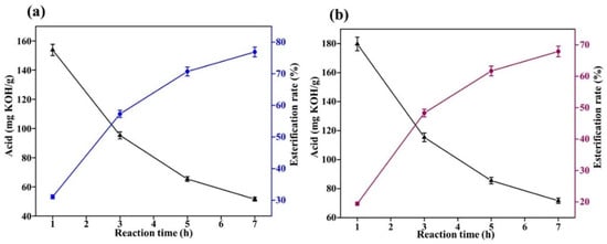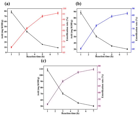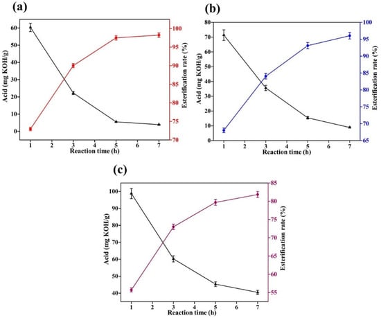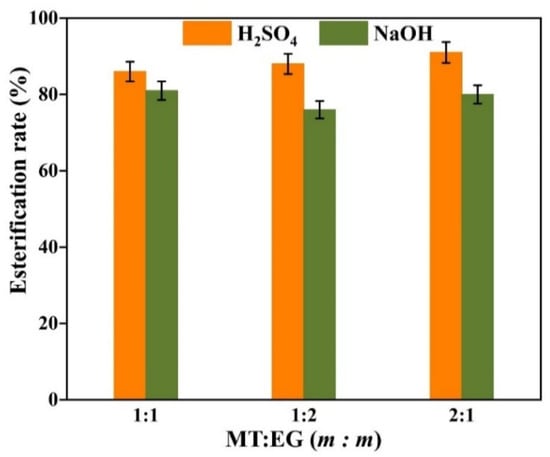 The factors affecting the reaction in a mixed esterification experiment are the experimental temperature, the catalyst, the mixing ratio of the two alcohols and the reaction time. According to the previous experiment, the optimal reaction time is 3 h. The mass ratio of methanol to ethylene glycol is set at 1:1. The acid value in the system is measured at the end of the reaction and the esterification rate is calculated according to Equation (4). The results of the experiment are shown in Figure 8.