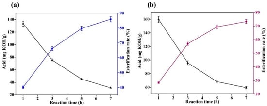Esterification rate = (pre-reaction acid value − post-reaction acid value)/pre-reaction acid value × 100% []. The calculation method of MT quality is as follows: