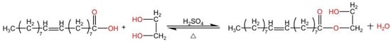 Equation for the esterification of oleic acid with ethylene glycol.