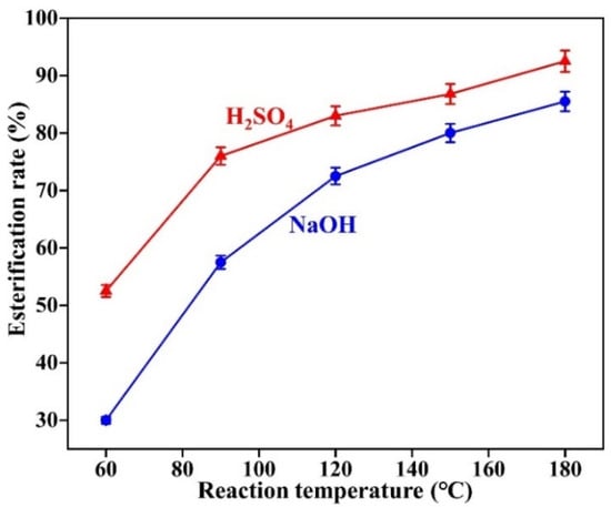 As can be seen from Figure 4, at a temperature of 120 °C and 3 h of reaction, the esterification rate was close to 70% under sodium hydroxide catalysis and less than 60% under sulfamic acid catalysis.