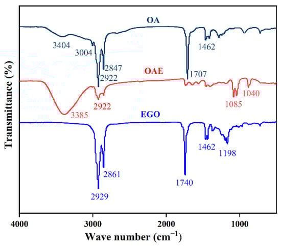 Infrared spectroscopy tests were performed on OA and esterification products OAE and EGO, and the test results are shown in Figure 10.