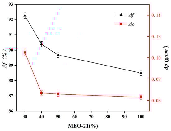 MEO-21 has excellent normal and high-temperature performance, so MEO-21 is used as the base oil, and industrial by-product white oil (WO) and oleic acid (OA) are added to it, and through different ratios, a drilling fluid lubricant with good lubricity and low density variation is obtained, named L-541. The results of the room temperature performance tests corresponding to different proportions of MEO-21 in the system are shown in Figure 11.