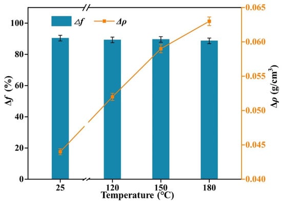 From Figure 12, it can be concluded that L-541 does not differ much from Δf at room temperature and after 16 h of hot rolling at 120 °C, 150 °C and 180 °C, the density is approximately 89%. This shows that L-541 has good high-temperature resistance, at the same time, the density change value is less than 0.08 g/cm3, and the density change value meets the index requirements.