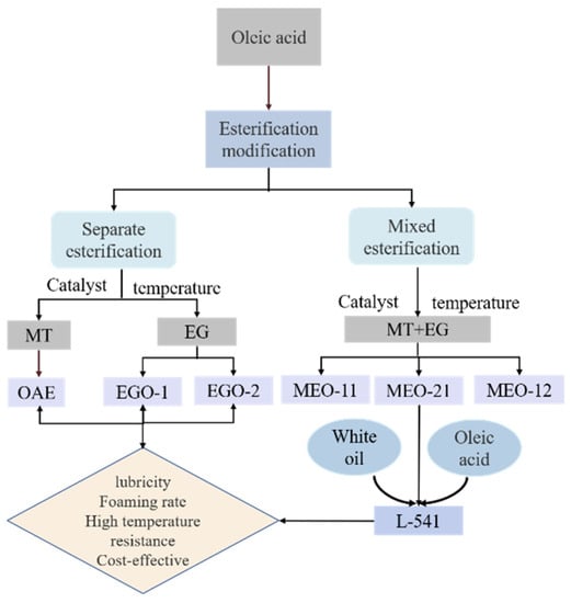 The esterification of oleic acid with methanol, catalyzed by concentrated sulfuric acid, is named as OAE. The esterification of oleic acid with ethylene glycol is named EGO (concentrated sulfuric acid catalyzed product: EGO-1; sodium hydroxide catalyzed product: EGO-2, esterification product (MT:EG = 1:1): MEO-11; esterification product (MT:EG = 2:1): MEO-21; esterification product (MT:EG = 1:2): MEO-12).