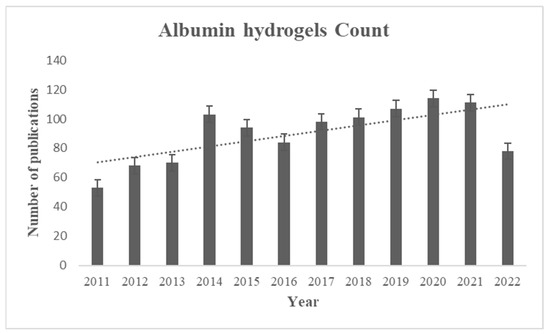 The number of publications of albumin-based hydrogels after 2011 using albumin hydrogels as a keyword to search in the PubMed database.