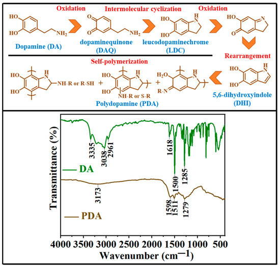 FTIR spectra of dopamine hydrochloride (DA) and polydopamine (PDA) coating were obtained. The upper section of the figure represents the oxidation of dopamine to polydopamine (from right to left and then bottom with black lines separating the different structures).