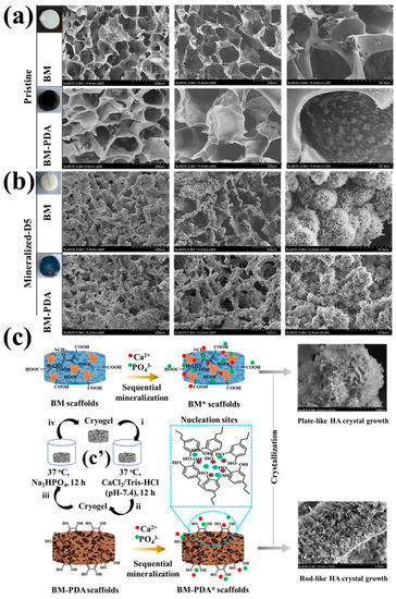 SEM cross-sectional descriptions of (a) pristine BM and BM-PDA, and (b)mineralized BM* and BM-PDA*. Insets in a and b represent the gross appearance of the as-prepared, functionalized, and mineralized cryogels. (c) Proposed mechanisms of the plate- and rod-like morphology of the mineralized scaffolds, respectively with c’ depicting the process of sequential mineralization (i–iv represents one cycle or one day treatment, consisting of a 12-h incubation in the CaCl2 solution, followed by a 12-h incubation in the Na2HPO4 solution, and a final 12-h rinse in deionized water).