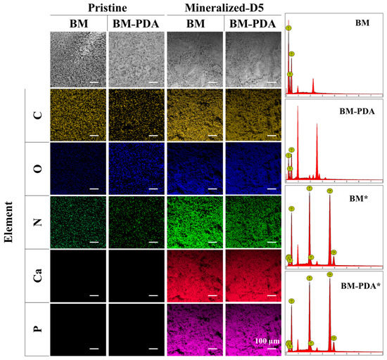 EDX plotting images of C, O, N, P, and Ca of BM, BM-PDA, BM*, and BM-PDA*. Scale bar = 100 μm.