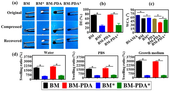 It is known that moisture aids in wound healing; it lessens scarring and dressing removal pain and does not obliterate newly produced tissue [68]. As a result, the produced scaffolds’ outstanding hydrophilicity and wetting qualities may be useful for wound dressing or other prospective biological applications. Herein, all scaffolds presented the sponginess and water-triggered shape recovery behavior illustrated in Video S3 and Figure 6a. It is obvious that in two seconds (Video S3), the pristine scaffolds (BM and BM-PDA) absorbed a lot of water and showed water-triggered shape recovery, indicating that their surface had excellent hydrophilicity.