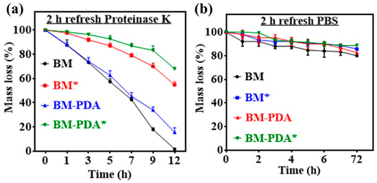 The goal of tissue engineering is to regenerate tissue while also causing the support matrix to degrade at a rate that can keep up with the growth of new tissue [74]. During the process of tissue regeneration, the matrix molecules produced by the cells unite to form a new ECM while the scaffold deteriorates. For bone tissue engineering, a regulated scaffold biodegradation rate that is comparable to a tissue regeneration rate is preferred [75]. Therefore, proteinase K, a broad-spectrum protease whose significant proteolytic activity in native proteins can be demonstrated under mild neutral conditions, was used to test the accelerated enzymatic degradation of the as-prepared pure and mineralized scaffolds [22]. Pristine and mineralized BM and BM-PDA scaffolds exhibited different times to degrade completely (Figure 7a). It took 12 h for the complete degradation of BM whereas BM-PDA degraded 85 ± 2 % for the same period. Strikingly, mineralized BM* and BM-PDA* degraded up to 35% and 40% only over 12 h. This result can be explained by the reason that HA reinforces the overall firmness of cryogels [76], thus providing more lasting support for bone regeneration. On the other hand, all scaffolds-maintained stability (the remaining mass percentage of each sample: 80 ± 1% for BM, 83 ± 3% for BM-PDA, 85 ± 1% for BM*, and 90 ± 2% for BM-PDA*) in PBS over a period of 72 h (Figure 7b). The enzymatic degradation results demonstrate that the mineralized scaffolds decomposed more slowly than pure scaffolds. Figure 5c, Table 3 shows that adding HA to BM scaffolds enhances their mechanical characteristics and lessens the capacity of the resulting mineralized matrixes to absorb water (Figure 6d). As a result, the mineralized scaffolds deteriorated slower than the pristine ones, which is consistent with the literature report [66].