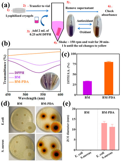 Antioxidant and antibacterial activity with the (a) experiment of DPPH assay, (b) DPPH radical scavenging activity of BM and BM-PDA, (c) DPPH radical scavenging activity (%) as obtained by the absorbance, (d) pictures of the BM and BM-PDA cryogels’ antibacterial sensitivity to E. coli and S. aureus after 24 h incubation. (e) The diameters of the E. coli and S. aureus inhibition zones in the BM and BM-PDA groups (the bar is used to demonstrate the two groups separately).
