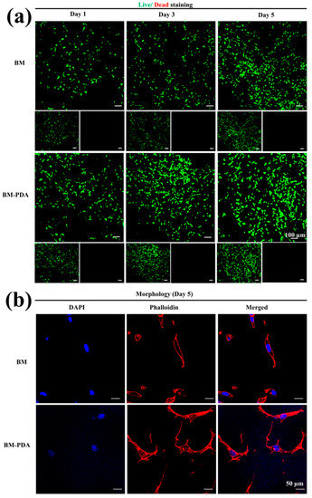 By cultivating L929 fibroblasts, the interaction between the cell and scaffolds was investigated. Figure 9a show that adding PDA to the BM scaffold can promote cell adhesion and migration [86]. Despite their biological adhesion, PDAs exhibit great interactions with cell receptors (e.g., integrin) and serum proteins such as fibronectin [87]. The introduction of hydroxyl functional groups improves hydrophilicity and improves the absorption of supplementary medium to nourish cells (higher swelling behavior in growth media as exhibited in Figure 6d). The number of cells had no obvious difference for both the BM and BM-PDA on days one to five (Figure S2). However, the proliferation of cells on BM-PDA scaffolds was higher than that on BM scaffolds on day 5. In general, cells proliferated well on both scaffolds, and there was essentially no cytotoxicity in both samples. To further govern the cell response, chiral molecules can be incorporated into the cryogel system by either co-assembly or a simple surface functionalization strategy. We are planning to investigate chirality-dependent cell adhesion and differentiation for creating bone tissue and regenerative therapies in the future [88,89]. According to CLSM micrographs (Figure 9b), fibroblasts adhered well to both scaffolds (BM, BM-PDA) while the spreading of fibroblasts was more obvious in the BM-PDA scaffolds.