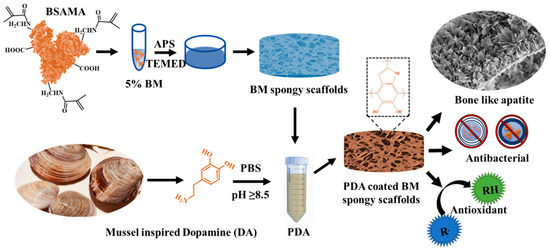 The preparation of BSAMA spongy scaffolds and functionalization with PDA to prepare PDA-coated BM spongy scaffolds exhibiting rod-like apatite morphology along with antibacterial and antioxidant activity.
