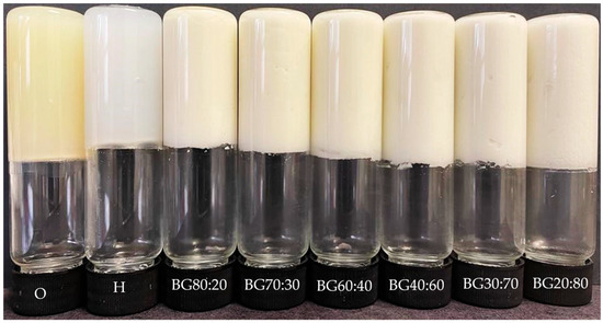 The ability of a gel to retain its appearance and structural integrity when inverted can be verified by a simple tube inversion test [20]. The tube inversion test, as well as the appearance of the O, H, and BGs with different O:H ratios, can be visualized in Figure 1. The H had an opaque white appearance, while the O had a yellowish appearance. Adding the O-phase to the H-phase altered the appearance of gels to a milky white coloration. The BG samples with a higher content of O-phase had a slightly more yellowish color than samples with a higher content of H-phase. The formation, appearance, and structure of a firm BG system depend on the composition and proportion of both phases. In this study, all BG samples were self-standing after inversion at room temperature, indicating that the concentration of the gelling agents used to form the individual phases and the selected ratios of O:H were suitable for formulating self-supporting BG.