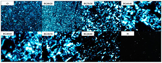 It can be noted that the higher the O-phase (i.e., BG80:20 > BG70:30 > BG60:40 > BG 40:60 > BG30:70 > BG20:80), the “lighter” the micrographs, as more fat crystals could be observed in the BG network structure. At a higher O-phase concentration (i.e., BG80:20) a higher distribution of fat crystals can be observed in the gel images, which confirms the formation of continuous gel networks. Similar results were found by Samui et al. [34], who also detected a high distribution of GM crystals covering the entire gel image.