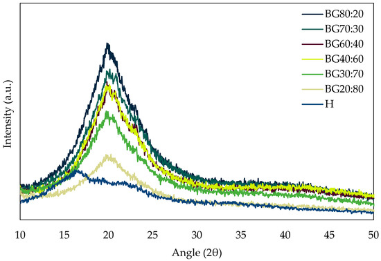 The absence of a crystalline peak in the H sample is linked to the amorphous nature of potato starch structures, which also influenced the decreases in the peak intensities in BGs with a higher H-phase (i.e., BG20:80). The absence of an apparent peak in the hydrogel diffractogram was also observed by Spagnol et al. [37], who characterized superabsorbent hydrogel nanocomposites based on starch. This confirms that starch hydrogels have a dominant amorphous structure with the absence of intense peaks.
