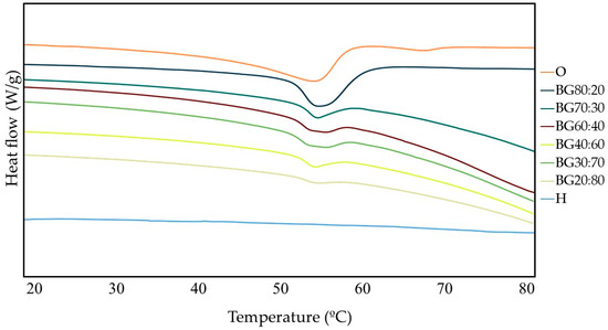 A Differential Scanning Calorimetry (DSC) analysis was carried out to characterize the thermal behavior of O, H, and BGs containing different O:H ratios. In Figure 4, melting peak temperatures are depicted, in which BG samples presented a well-defined peak in the heating step in the range of 51.92 °C to 53.70 °C. Even though there was no significant difference (p > 0.05) between the BG samples (Table 1), it was observed that as the O-phase increased, the peak became more expressive.
