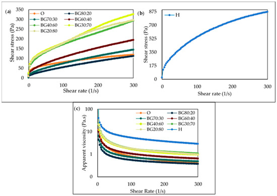 The shear rate versus the shear stress of O, H, and BG samples can be visualized in Figure 5a,b. It can be noted that all samples presented a similar initial shear stress upon the application of a shear rate. In Figure 5c, it is possible to observe that the apparent viscosity of all samples decreased under increasing shear rates, evidencing a shear-thinning behavior, which is typical of non-Newtonian fluids.