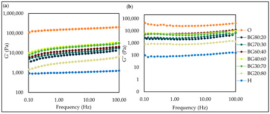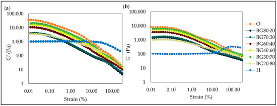 The amplitude sweep allows for the identification of the linear viscoelastic region (LVR), which corresponds to a region where the sample does not show a structural breakdown under the application of mechanical forces [46]. Figure 6 shows the amplitude sweeps of all BG and individual gels (O and H). Results showed that G′ was higher than G″ within LVR, indicating a predominantly elastic behavior. BG was formed in all ratios evaluated in this study, and the LVR was similar for all BG samples.