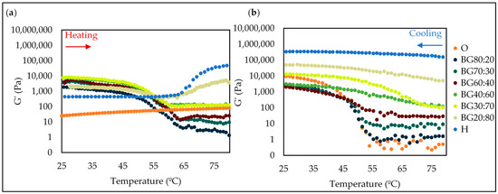 At the earlier stage of heating (5–45 °C), storage modulus (G′) of the BGs with a higher O-phase (i.e., BG80:20, BG70:30, BG60:40, BG40:60, and BG30:70) was almost constant (Figure 8), and after a structure breakdown at ~50 °C, a fast decrease in storage modulus was observed, suggesting the onset of destabilization of the systems. The most pronounced G′ decrease occurred at 50–65 °C, which corresponded to the phase transition temperatures of GM oleogels (melting of GM) [49]. At temperatures above 60 °C, most BGs had higher G′ than G″, indicating that the systems had more elastic than viscous properties.