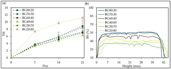 The Turbiscan stability index (TSI) results were higher for the BG20:80 sample, revealing a level of instability varying from 0.0 ± 0.0 to 11.2 ± 0.5; since the higher the TSI value, the more unstable the system becomes [58]. In this context, the bigels with better stability were BG40:60, BG80:20, and BG70:30, which varied from 0 to 5.9 ± 0.1, 6.3 ± 0.9 and 6.8 ± 0.5, respectively.