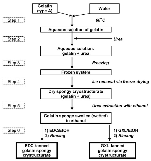 The EDC- and GXL-tanned gelatin cryostructurates were synthesized according to the block diagram shown in Figure 1 and described in Section 4.2. This rather simple (in terms of manipulations) process consisted of the preparation of the aqueous solution of precursors (gelatin and urea), its freezing, its freeze-drying, the extraction of urea with ethanol (non-solvent for gelatin), the chemical cross-linking (tanning) of the gelatin with EDC or GLX, and the final rinsing of the resultant spongy biopolymeric material with ethanol.