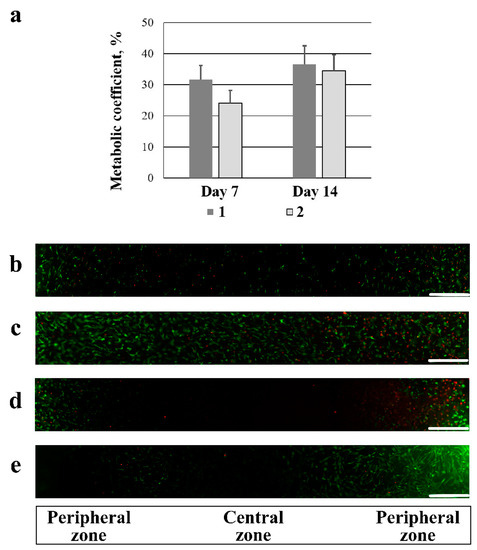 Viability and proliferation of hADSCs adhered onto the EDC- and GXL-tanned gelatin scaffolds: (a) hADSC proliferation on the EDC- and GXL-tanned gelatin-based cryostructurates (1—EDC-tanned scaffold; 2—GXL-tanned scaffold); (b) hADSC viability on day 7 on the EDC- tanned scaffold; (c) hADSC viability on day 7 on the GXL-tanned scaffold; (d) hADSC viability on day 14 on the EDC- tanned scaffold; (e) hADSC viability on day 14 on the GXL-tanned scaffold. Live cells were green-stained using calcein-AM, and dead cells were red-stained using ethidium homodimer. Scale bar = 500 µm.