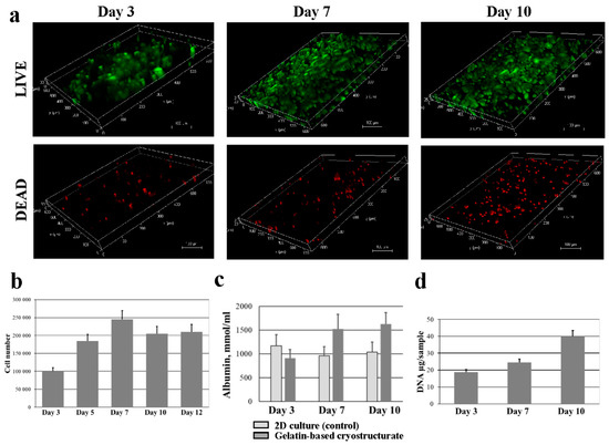 Proliferation and liver function of HepG2 cells attached to gelatin-based cryostructurate. (a) HepG2 viability at 3, 7, 10 days on gelatin gelatin-based cryostructurate. Live cells were green-stained using calcein-AM, and dead cells were red-stained using ethidium homodimer. Scale bar 100 µm; (b) HepG2 proliferation on gelatin gelatin-based cryostructurate (scale bar 100 µm); (c) Albumin secretion; (d) DNA content.