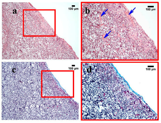 Representative images of the gelatin sponge on the 21 day of subcutaneous implantation: (a,b) hematoxylin and eosin staining; (c,d) Masson staining. Scale bar = 100 µm. Blue arrows—blood capillaries.