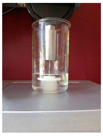 The measurements of the elastic characteristics of the water-swollen gelatin cryostructurates were performed using the cylindrical spongy samples that were 16 mm in diameter and 20 mm in height. Such measurements were accomplished in accordance with a technique that was previously employed for a case of soft spongy cryogels produced from the aqueous solutions of locust bean gum [82]. During our experiments, each swollen sample was placed in a glass beaker filled with water in order to compensate the loss of capillary pressure upon water squeezing from the capillaries following the uniaxial compression. A ‘plate-like’-type punch with a diameter of 10 mm and a thickness of 2 mm was used to minimize the action of the buoyancy of the liquid on the punch connected to the holder of an a TA-Plus automatic texture analyzer (Lloyd Instruments, West Sussex, UK) (Figure 7). Compression was performed at a loading rate of 0.3 mm/min until 50% deformation, and the value of the compression modulus was determined by the instrument-built software. Since the rigidity of similar swollen heterophase spongy materials is the sum of the strength of the polymeric phase (swollen gel walls of macropores) and capillary forces, the physical sense of the measured elastic modulus values somewhat differs from that of homophase gels. Therefore, below, with regard to the gelatin cryostructurates, we call these values the apparent instantaneous compression moduli—Eapp.