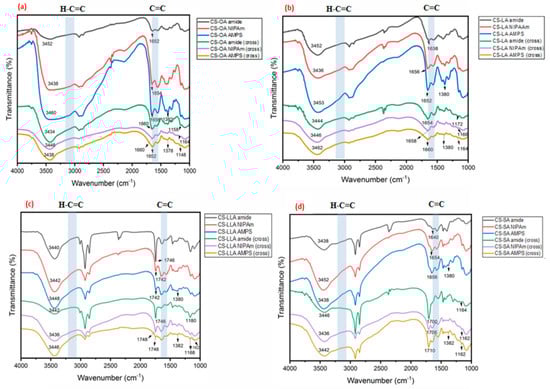 −1 in the C = C stretch of acryl monomers in the CS-AMPS/NIPAm hydrogel spectrum indicated the Michael addition of acryl monomers to the amino groups of CS. In addition, the cross-linked samples showed the same functional groups as non-cross-linked ones with small noticeable band shifts, alongside the appearance of new bands in the range of 1148 to 1180 cm