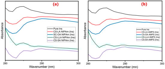 max of 284 nm and the same was determined by scanning the drug-containing solution with UV-Vis spectrophotometer over a range of wavelengths (200–500 nm), where distilled water was used as blank. As can be seen from the analysis, both pure insulin and insulin-loaded hydrogel matrices demonstrated the maximum absorption at the wavelength range of 280 to 290 nm, thereby indicating the successful loading of insulin within the hydrogel matrices. In the graph, which shows a comparison of the pure insulin spectrum with those of the other four samples, the absorption maxima can be observed for all; however, a change of intensity was observed due to the different levels of drug loading on each hydrogel matrix.