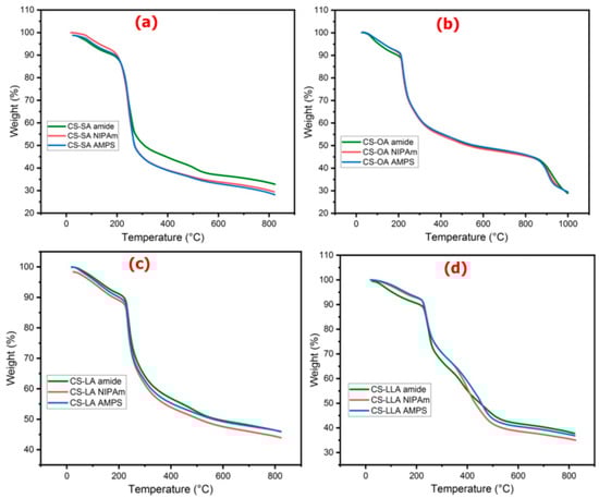 The TGA of CS-amides compared to that of NIPAm and AMPS-modified CS amides are shown in