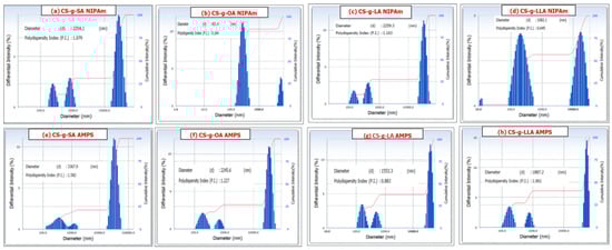Figure 4a–h. The TEM micrographs revealed that the modified CS NPs appeared as solid spheres; from the particle size analysis, it was found that the AMPS-modified CS NPs (