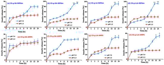 During further comparisons of insulin release (%) at two different pHs (1.2 and 7.4), both the NIPAm and AMPS-modified CS-fatty acid amide samples showed an enhanced release capacity at the neutral pH of 7.4 as compared to the acidic pH of 1.2. In the release studies, the NIPAm-modified CS samples proved to be better releasing agents (than AMPS-modified ones) with the highest releases of 92.9% (for CS-g-OA-NIPAm with EE of 60.8% and ET of 24 h) and 92.8% (for CS-g-LLA-NIPAm with EE of 85.5% and ET of 24 h) at the neutral pH of 7.4. However, for the AMPS-modified samples at a pH of 7.4, the highest release was noted for CS-g-LA-AMPS with 87.4% (from the EE of 76.6% and ET of 15 h) and lowest release of 22.2% for CS-g-SA-AMPS (78.6% EE and ET of 6 h). For the CS-g-OA-AMPS sample, although observed to have an EE of 85.5%, the release at pH 7.4 was noted to only have an EE of 56.8% and ET of only 7 h. Therefore, from the comparison of all the insulin-loading and release data onto the matrices of NIPAm or AMPs-modified CS, the CS-g-LLA-NIPAm sample was confirmed to be the superior drug-releasing agent with its highest EE and ET at pH 7.4. Additionally, by comparing these results with earlier published data on CS-modified fatty acid samples (CS-g-SA, CS-g-OA, CS-g-LA, and CS-g-LLA) without stimuli polymer (NIPAm and AMPS), it is clear that the addition of polymers significantly enhanced the drug-loading capacity of all hydrogel matrices [