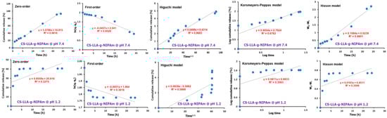 Table 3). When comparing the obtained data, it might be confusing to discuss all the information, i.e., eight samples with five different kinetic models, and at two pHs; therefore, we focused mainly on the NIPAm- or AMPS-modified CS-g-LLA samples (