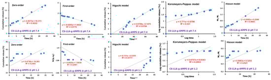 To understand the insulin-release mechanism for CS-based fatty acid amides modified with NIPAm or AMPS matrices (with cross-linking), the drug delivery data were tested against five different pharmacokinetic studies including zero-order, first-order, Higuchi, Korsmeyers–Peppas, and Hixson models (