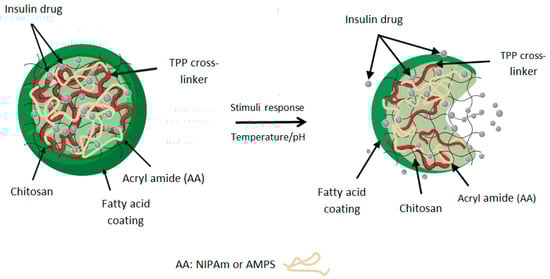 24]. An illustration of the insulin-release mechanisms from the CS-based fatty acid amide matrices with NIPAm or AMPs modification is provided in