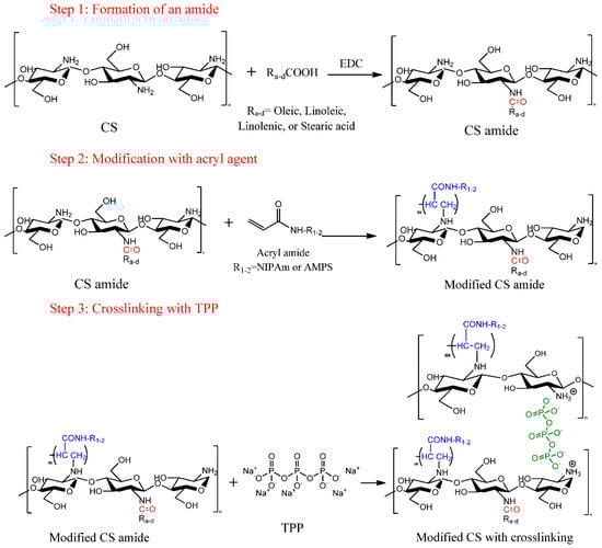 For the modification, 1 g of CS-g-fatty acid amides was dissolved individually in 50 mL of distilled water containing 0.5 mL of acetic acid. To this solution, 2 g of either of the acrylic reagents (NIPAm or AMPS) was added and subjected to stirring at 50 °C for 2 days; afterwards, ammonium hydroxide was added to precipitate the corresponding hydrogel.