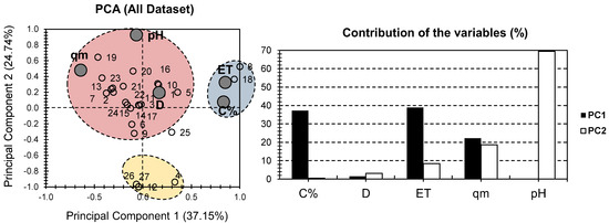 PCA analysis was conducted on previously published data (Table 1) from the study of Pereira et al. [10]. Figure 1 presents the PCA bi-plot for previously published data on the physical and chemical properties of various composite hydrogels containing MONPs used for dye removal from water [10]. The first two PCs were responsible for 61.89% of the total variance (37.15% for PC1 and 24.74% for PC2) (Figure 1). When the physical and chemical properties of composite hydrogels containing MONPs (and derivatives) were considered, they yielded similar results to those of PCA [29]. This indicates that the PCA approach is equally efficient for both dataset approaches. ET provided the highest contribution to PC1 for the factor MONP% and accounted for 76% of its total contribution. The high contribution of MONP% was surprising, given that fewer data for this factor were provided following the various investigated samples (Table 1). In terms of PC2, pH was the most significant factor, accounting for 70% of its total contribution. The large disparity in factor contribution following the first two PCs indicates the representability of the investigated physical and chemical properties for the various hydrogels under consideration. MONP% and ET had a strong positive influence along PC1, with no to minor positive influence along PC2. This could probably indicate a high correlation between the necessary time to reach equilibrium, from one side, and the carbon content, from the other side. Nonetheless, this could not be confirmed or infirmed following the shortage in data with regard to the carbon content. For pH, it showed a high positive influence along PC2, with no influence along PC1. As for qm, it showed an average negative influence, and a positive influence along PC1, and PC2. Interestingly, D showed nearly no influence on either PC.