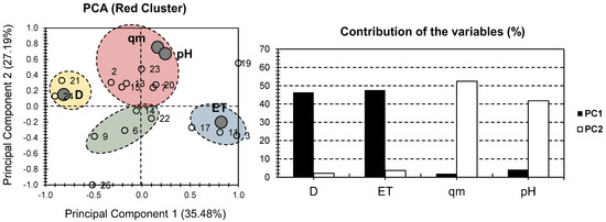Figure 3 presents the PCA bi-plot for the physical and chemical properties of the samples of the red cluster in Figure 2. The first two PCs accounted for 62.58% of the total variance (35.48% for PC1, and 27.19% for PC2; Figure 3). For the factors, the highest contribution was scored for D and ET, along PC1 (46.38% and 47.57%, respectively). For PC2, the highest contribution was scored for qm and pH (52.47% and 41.74%, respectively). Interestingly, a high distribution of the factors can be noticed, as in the case of Figure 2. ET had a strong positive influence on one side of PC1, while D had a strong negative influence on the other. Both pH and qm had a significant positive influence along PC2, with a minor positive influence along PC1.