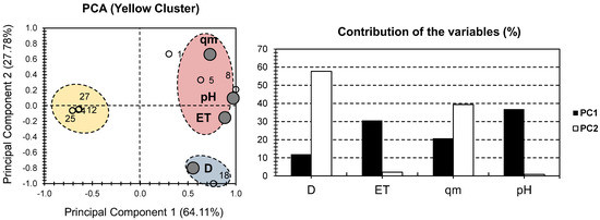 Individually, and similarly to the “all dataset” case, three distinct clusters can be identified when MONP% is considered (Figure 2). The majority of the samples were found in the red cluster, which is positively correlated with both pH and qm. The yellow cluster contained a smaller number of samples than the red cluster. It included samples 1, 4, 5, 8, 12, 18, 25, and 27, all of which showed a strong positive correlation with ET. Interestingly, more samples were more likely to be influenced by the time to reach equilibrium when MONP% was excluded. Only hydrogel samples 10 and 16 were found in the blue cluster, which was positively correlated with D. Nonetheless, the lack of data input for these two samples makes a non-speculative conclusion about the origin of this proximity impossible. In summary, when the MONP% was excluded, the dataset’s representativeness increased. This is demonstrated by the greater contribution of total variance in Figure 2 than in Figure 1. A “separation of individuals” approach was used to improve the presentation of the dataset. The goal was to perform a PCA on each cluster to gain a better understanding of the similarities and differences between the hydrogel samples under consideration.