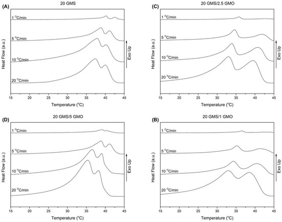 DSC cooling curves for cooling rates of 1, 5, 10, and 20 °C/min for (A) 20 GMS, (B) 20 GMS/1 GMO, (C) 20 GMS/2.5 GMO, and (D) 20 GMS/5 GMO.