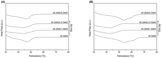 Figure 4A shows the melting curves of the formulations directly after they were cooled to 4 °C at a cooling rate of 1 °C/min (freshly prepared), while Figure 4B shows the melting curves of the formulations after being stored at 4 °C for 24 h. The peak melting point values are summarized in Table S2. The freshly prepared samples exhibit a single broad transition peak, with 20 GMS and 20 GMS/5 GMO samples having higher peak melting temperatures (Figure 4A). The absence of two distinct peaks corresponding to the melting of the inverse lamellar phase at higher temperatures and the melting of the sub-α crystals at lower temperatures [18] are indicative of the presence of overlapped peaks, possibly meaning that the system is transitioning to the more stable sub-α phase during the cooling process [18]. The lower overall peak melting temperature, compared to pure GMS (60.05 °C), is attributed to MCT oil acting as a solvent and plasticizing the system [28].