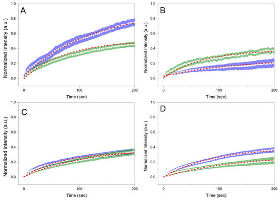 Normalized recoveries (FRAP) plotted against recovery time for (A) 20 GMS, (B) 20 GMS/1 GMO, (C) 20 GMS/2.5 GMO, and (D) 20 GMS/5 GMO samples. Green and blue highlighted curves represent samples before and after the whipping process, respectively. Red highlighted curves represent the fitted exponential model.
