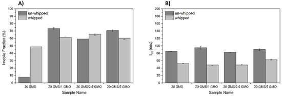 Figure 6 shows the normalized recoveries plotted against the recovery time for the different samples before and after whipping/foaming. For 20 GMS samples, the whipping process results in a significantly higher immobile fraction value (Figure 7A) compared to the homogeneous un-whipped sample. This observation can be a strong indication of GMS adsorption at the interface, where its hydroxyls are no more detrimental to (dispersion force-dominated) bulk structural integrity. This phase separation is representative of the inferior mechanical properties of this type of material. The presence of phase separation is also hinted by the higher t1/2 value of 20 GMS un-whipped samples (Figure 7B). The addition of even small amounts of GMO inhibits mobility, hinting at its role as a crystallization nucleator. The selective adsorption of GMO and GMS at the interface does not appear to affect such processes. In all cases, introduction of GMO and/or GMS results in the reduction of t1/2, which is in line with the mobility decrease for molecules that are confined to an interface.