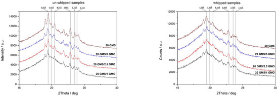 Whipped and un-whipped samples were studied by XRD analysis to determine and evaluate the crystalline phases present in the system (Figure 8). Both types of samples have similar patterns indicating that the foaming process does not alter the crystalline structure of the samples. Additionally, both types of samples exhibited the typical XRD pattern of the short spacings of orthorhombic sub-α packing (0.417 nm, multiple from 0.408 nm to 0.364 nm) [1]. Sub-α and α crystals are not in a thermodynamically stable state and are expected to undergo polymorphic transition to β crystals. The sub-α crystalline phase can either transition to an α-alpha polymorph, and subsequently to the most stable β-polymorph, or transition directly to latter [1]. The diffractographs in Figure 8 reveal the presence of both sub-α and β crystals (0.360, 0.370–0.390, and 0.460 nm) [1]. The presence of multiple crystalline phases indicates that the transition to β crystals is an on-going process that has not been fully completed at the time of the experiment. Additionally, the presence of multiple crystalline phases including α crystals could possibly explain the lower peak melting temperature (DSC heating curves) of 20 GMS/1 GMO and 20 GMS/2.5 GMO after 24 h of storage at 4 °C, as was previously discussed. Of interest is the loss of crystallinity after foaming. This is in line with the inability of interfacially adsorbed GMO and GMS to exert a 3D crystal network, and further supports the original hypothesis that these molecules selectively reside at the air–fat interface.