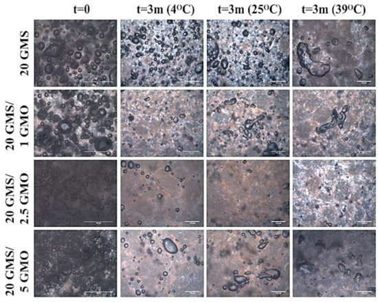 Figure 9 summarizes the micrographs obtained for the different foam formulations after a period of three months and under different storage conditions. The air bubbles are expected to ripen/coalesce, shrink, and, finally, disappear, as in the case of the 20 GMS/2.5 GMO sample. More specifically, the 20 GMS/2.5 GMO sample partially retained its initial foam structure when stored at 4 °C, but the amount of entrapped air was minimal. On the other hand, the foam structure was no longer present at the other two storage temperatures, where the air bubbles were absent and signs of intense phase separation were present (dark islets attributed to free oil). The same observations could be made for the 20 GMS/1 GMO sample, except for the presence of some remaining air in the form of coalesced bubbles. On the other hand, the 20 GMS and 20 GMS/5 GMO samples retained their foam structure, even though the air bubbles shrunk significantly and there was intense bubble coalescence/disproportionation. As an overall performance evaluation, the 20 GMS/5 GMO sample retained its foam structure to a greater extent compared to the other formulations. This conclusion is deduced by taking under consideration the completion of the orogenic phase separation at this GMO concentration.
