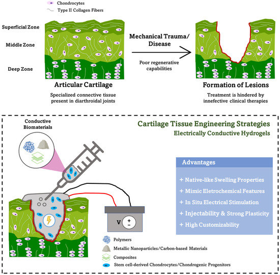 Electrically conductive hydrogels as a promising tool for the repair of articular cartilage defects caused by trauma or debilitating diseases such as osteoarthritis (top). These functional conductive hydrogels present several advantages for cartilage tissue engineering strategies (bottom).